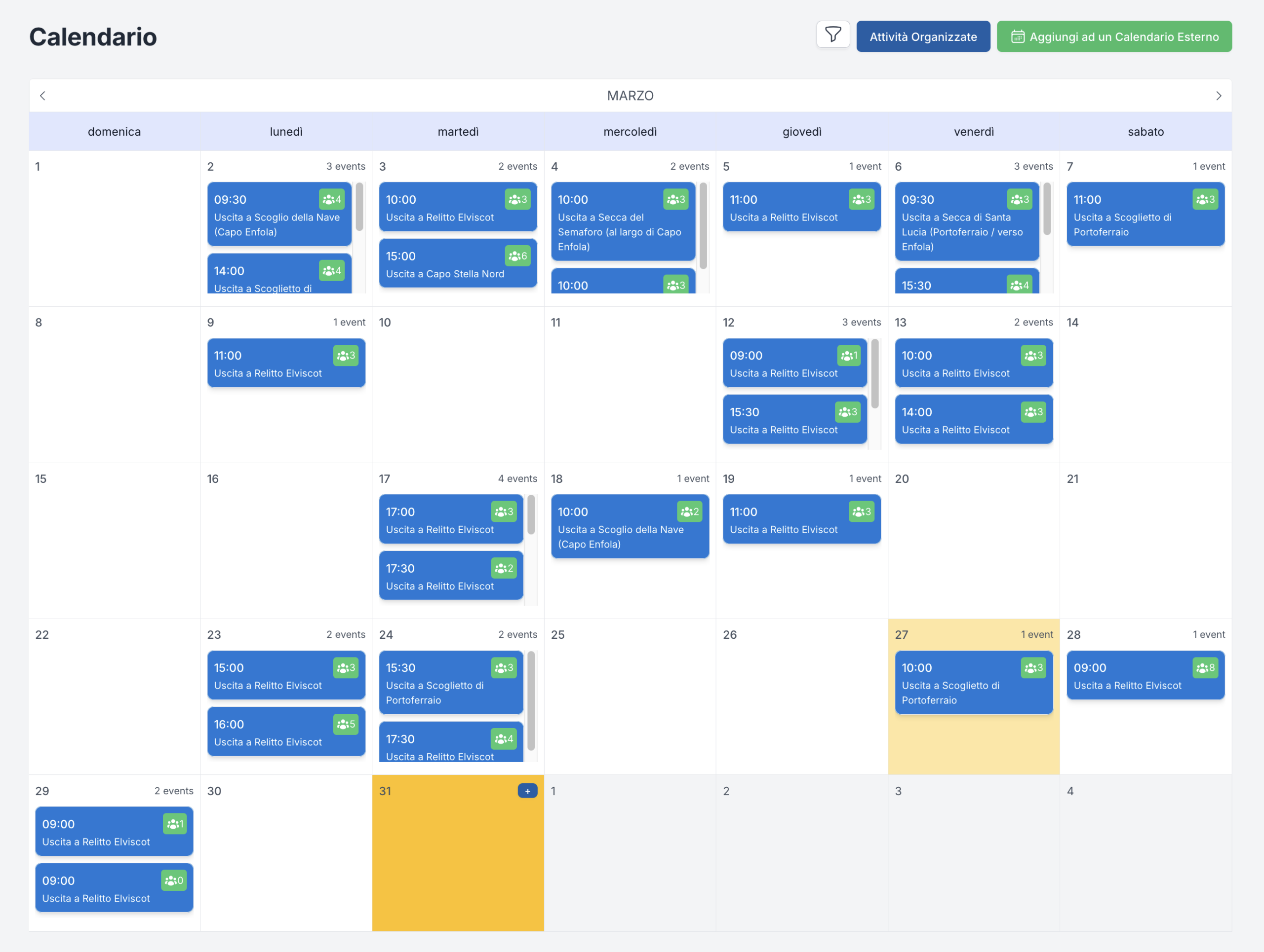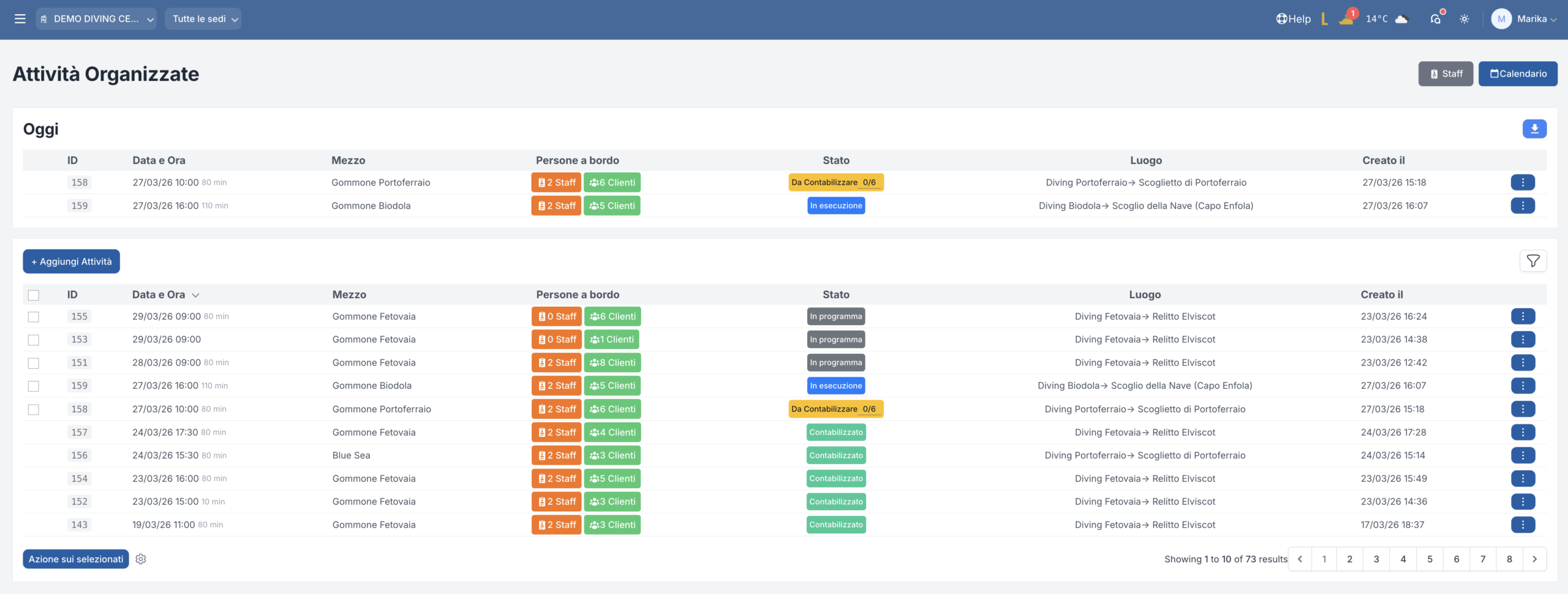 Le attività possono essere filtrate per data, mezzo, luogo, stato, staff o altri parametri rilevanti. In questo modo è semplice isolare solo le uscite che servono in quel momento, senza perdere tempo in elenchi lunghi o consultazioni manuali.